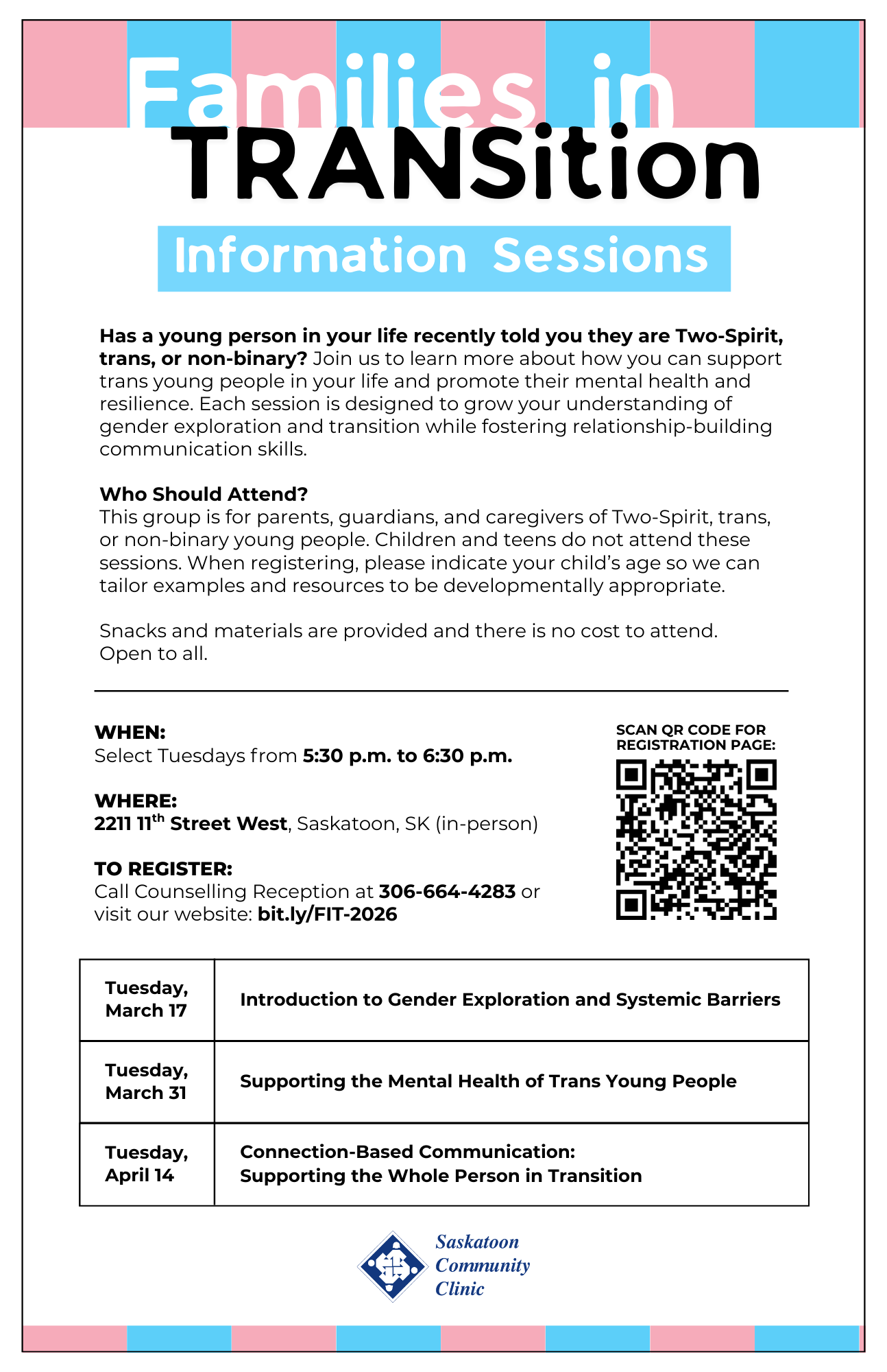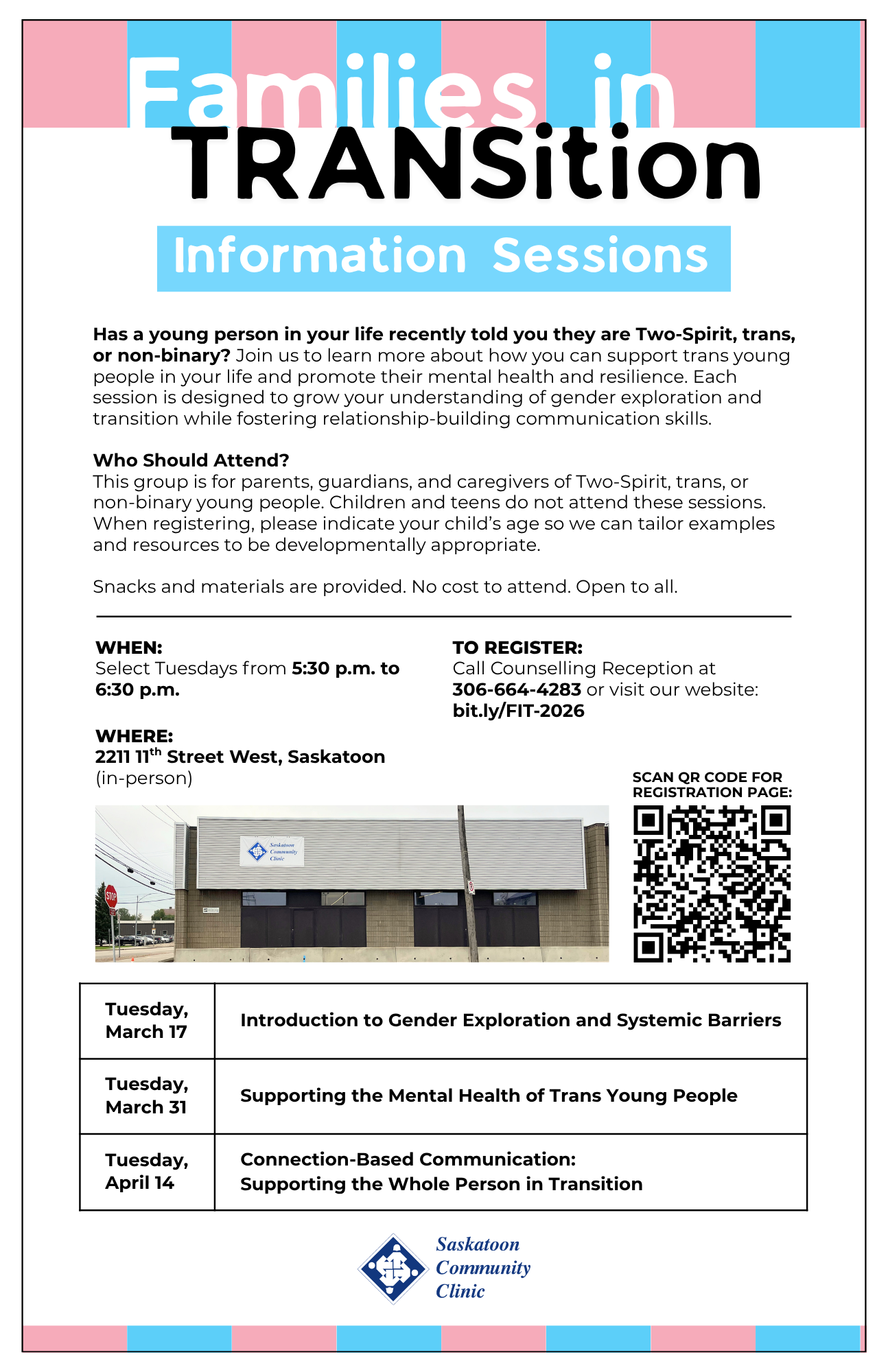 Has a young person in your life recently told you they are Two-Spirit, trans, or non-binary? Join us to learn more about how you can support trans young people in your life and promote their mental health and resilience. Each session is designed to grow your understanding of gender exploration and transition while fostering relationship-building communication skills.